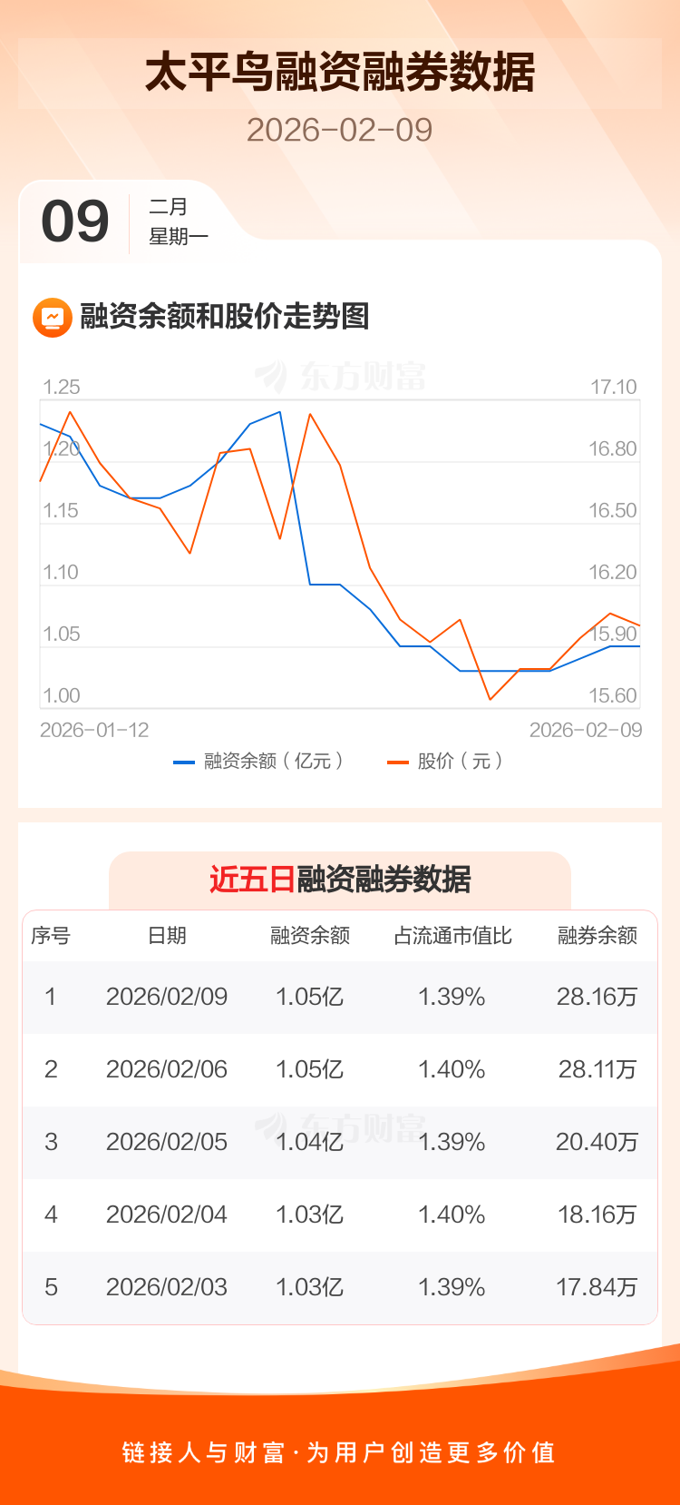 交易所最新数据显示,太平鸟于2026年2月9日获融资买入342.48万元,融资偿还396.53万元,当日融资净偿还54.05万元。目前,该股融资余额1.05亿,占流通市值比例为1.39%。