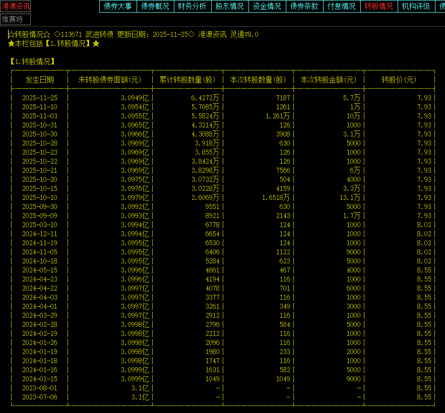 提示:我认为武进不锈(代码:603878)股票价格自 2025 年 10 月 16 日起至 2025 年 10 月 31 日已有 10 个交易日的收盘价不低于“武进转债”当期转股价格(即 7.93 元/股)的 130%(即 10.31元/股)。若未来 18个交易日内仍有 5 个交易日公司股票价格继续满足相关条件的,将触发“武进转债”的赎回条款。