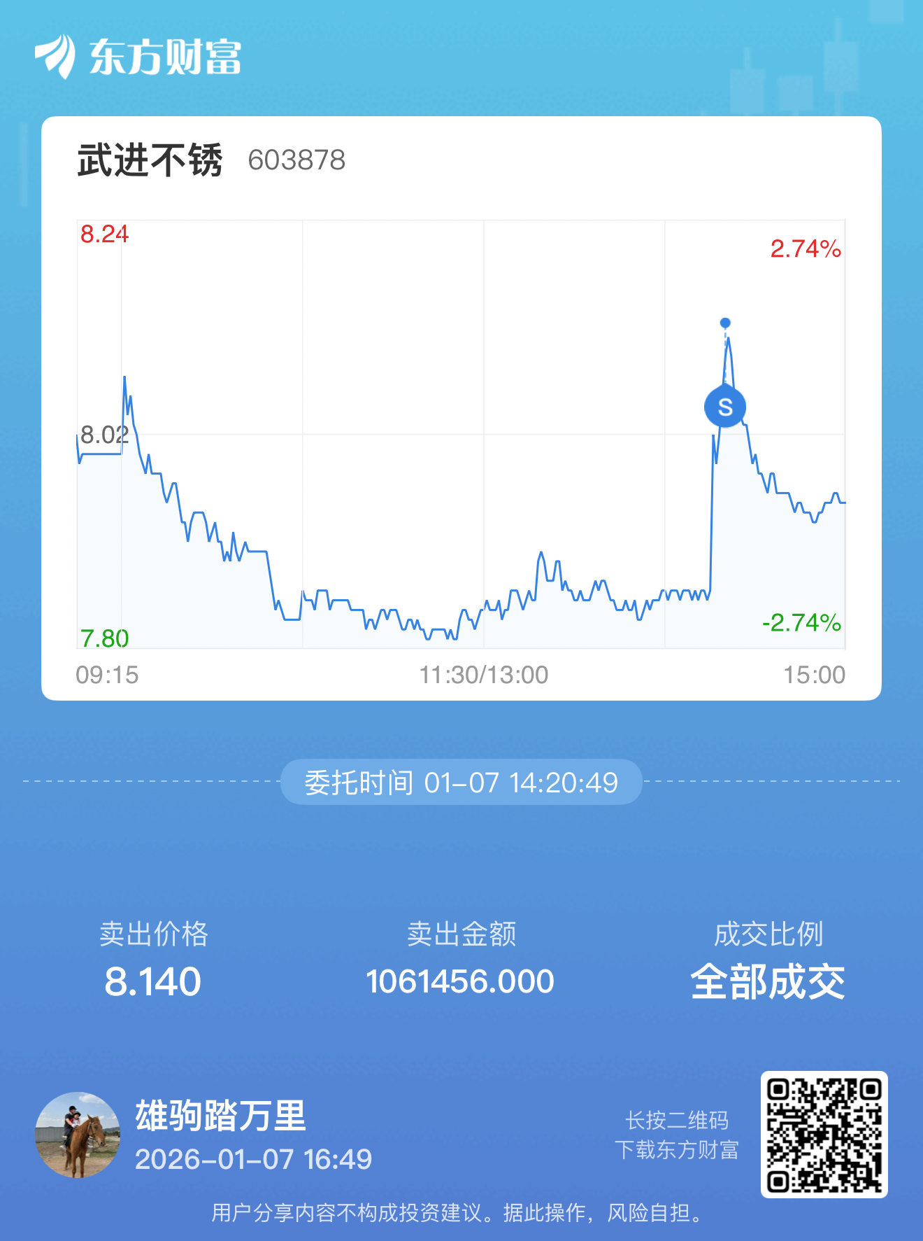 $武进不锈(SH603878)$ 拜拜了,冒高我给砸了。不好意思