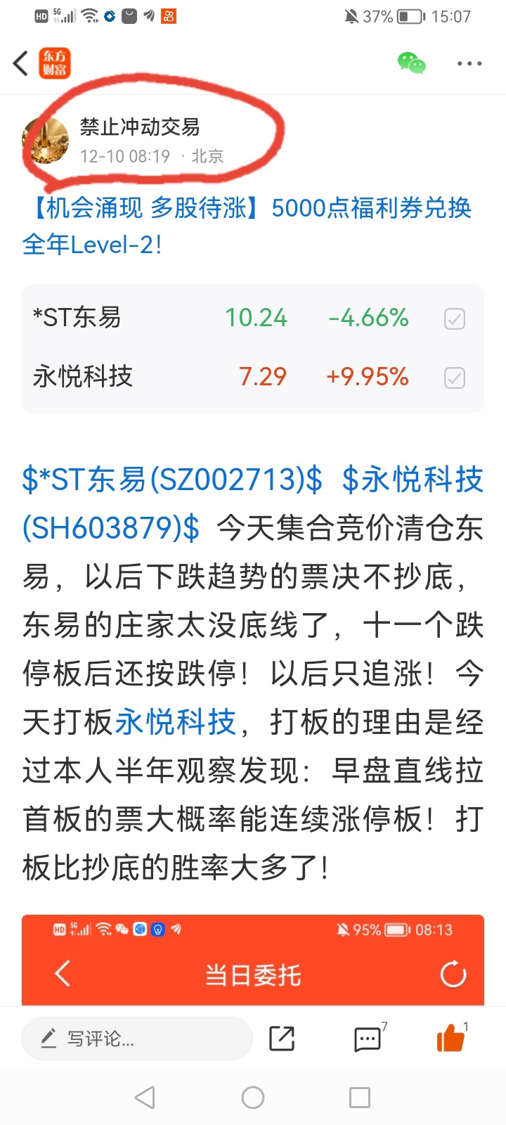 $永悦科技(SH603879)$ $*ST东易(SZ002713)$ $ST中迪(SZ000609)$ $*ST正平(SH603843)$ 今天早上8点19分开盘前一个小时复盘了永悦科技昨天的走势,发现永悦科技首板直线拉涨停很强势!决定清仓ST东易打板永悦科技!最终在集合竞价以6.63元买入永悦科技!果然永悦科技直线拉涨停炸板后又回封涨停板!而下跌趋势的东易继续阴跌!以后只追涨不抄底!