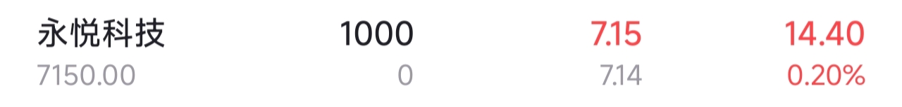 7.14元,买了1000股,今天的行情下,还能红,说明很强势,明天大概率可能涨停