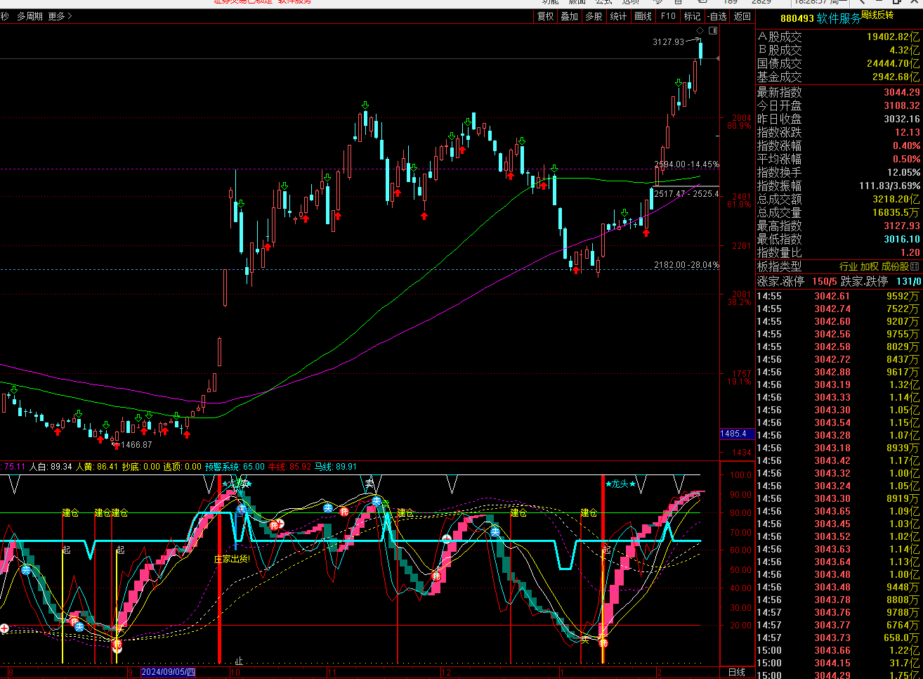 这几天天天提示大家看看软件服务指数周线分析,软件服务指数周线现在MACD是红马飙升的图形,在日K线里面看它是一个加速赶顶的一个趋势,这个地方如果一旦软件服务指数出现向下的回调,周线出现两根阴线的话,那么这个位置软件服务周线就是顶背离。那么软件服务周K线MACD就是周线过左肩的双头,那他就是卖点不是买点。说了如果追高那就是高位的接盘。