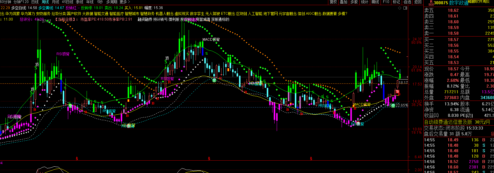 还是这样说不要去追涨,特别是高高在上的最热闹的地方,人多了容易感染病毒。要知道去高从低。数字经济里面涨幅不大的个股依然还可以留一下。指标每次超过80都有回调的风险。再看看软件服务指数,这几天软件服务指数是过了前面的高点,前面的高点我们看成是左肩,左肩突破之后一般来讲都会有回踩。但是个股没有大涨的依然有补涨的机会。这几天一直都在说软件服务里面的个股使风险大于机会。随时都有可能掉头向下,出现大阴线下杀,今天大家就看到了。软件相关的科技股里面还有 AI+数据安全、 AI+智慧城市、AI+电力软件、 AI+智慧交通等上涨幅度不大。