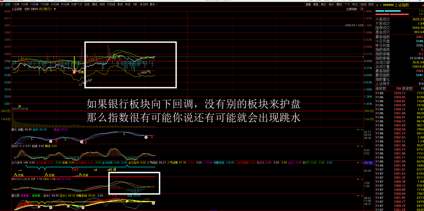 昨天在直播间提示大家,今天很有可能会是银行板块出来护盘拉升指数,把指数拉起来刷新高点,今天果然银行指出盘中上涨1.8%,在11:07分的时候,直播间提示,银行股建了今天的高点,如果下午没有别的权重股出来护盘,那么大盘就会出现跳水,今天下午大盘果然往下跳了,上证指数下跌32个点。通过这两天的成交量看盘,成交量放了但是指数没怎么涨,意味着追高的人越来越谨慎了。