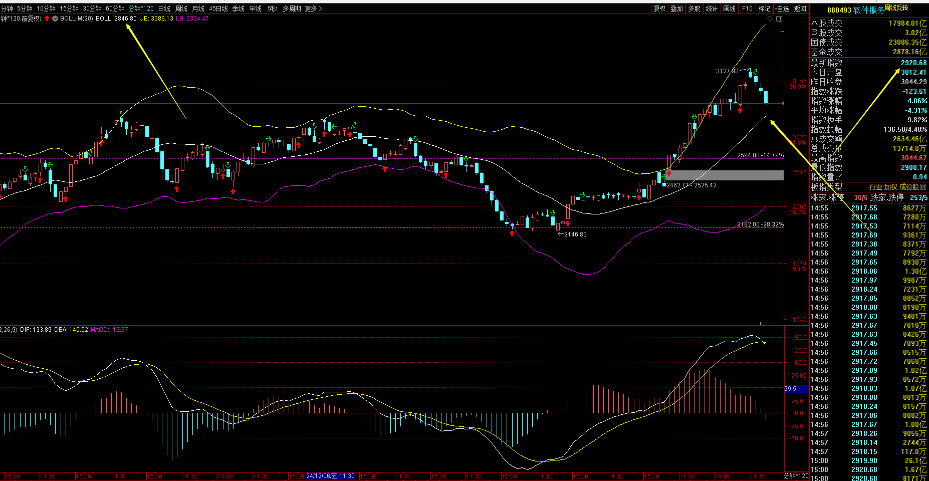 昨天说了现在软件服务指数日K线macd指标的柱状体现慢慢缩短。那么这就是股价指数与指标形成了背离.,软件服务指数120分钟今明两天将会形成向下的死叉。今天120分钟果然已经形成向下死叉,意味着这个高点就到此结束。我就问你们软件服务指数今天是不是领跌的?明天软件服务指数,120分钟会回踩一下布林线的中轨,在布林线的中轨位置还会反反复复拉起来,做15分钟和30分钟的双头。布林线的中轨位置也就是日线里面的10天线位置,也就是说明天软件服务指数会回踩10天线,然后会止跌企稳反弹2~3天小阳线后面再次下跌。明天早盘软件服务指数大概还有2.2%左右的回调,就会拉起来。
