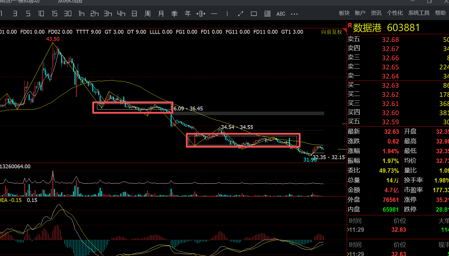 数据港可能短线见底了:1.日线级别出现神奇九转指标参考2.日线高点43.5下跌以