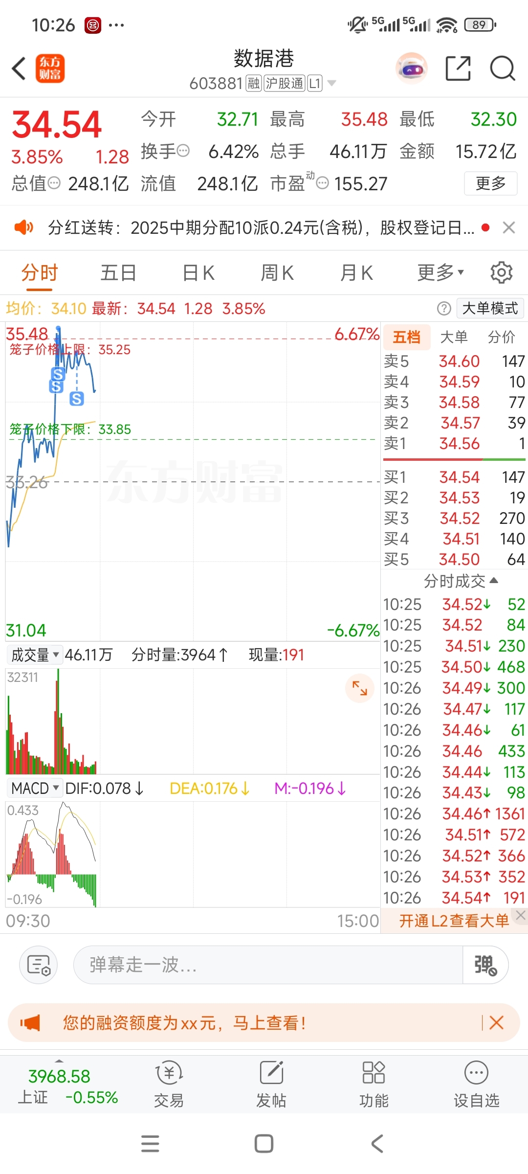 数据港上方35.4。附近压力还是很大的。到这个位置可以先提出一部分,低了还可以再