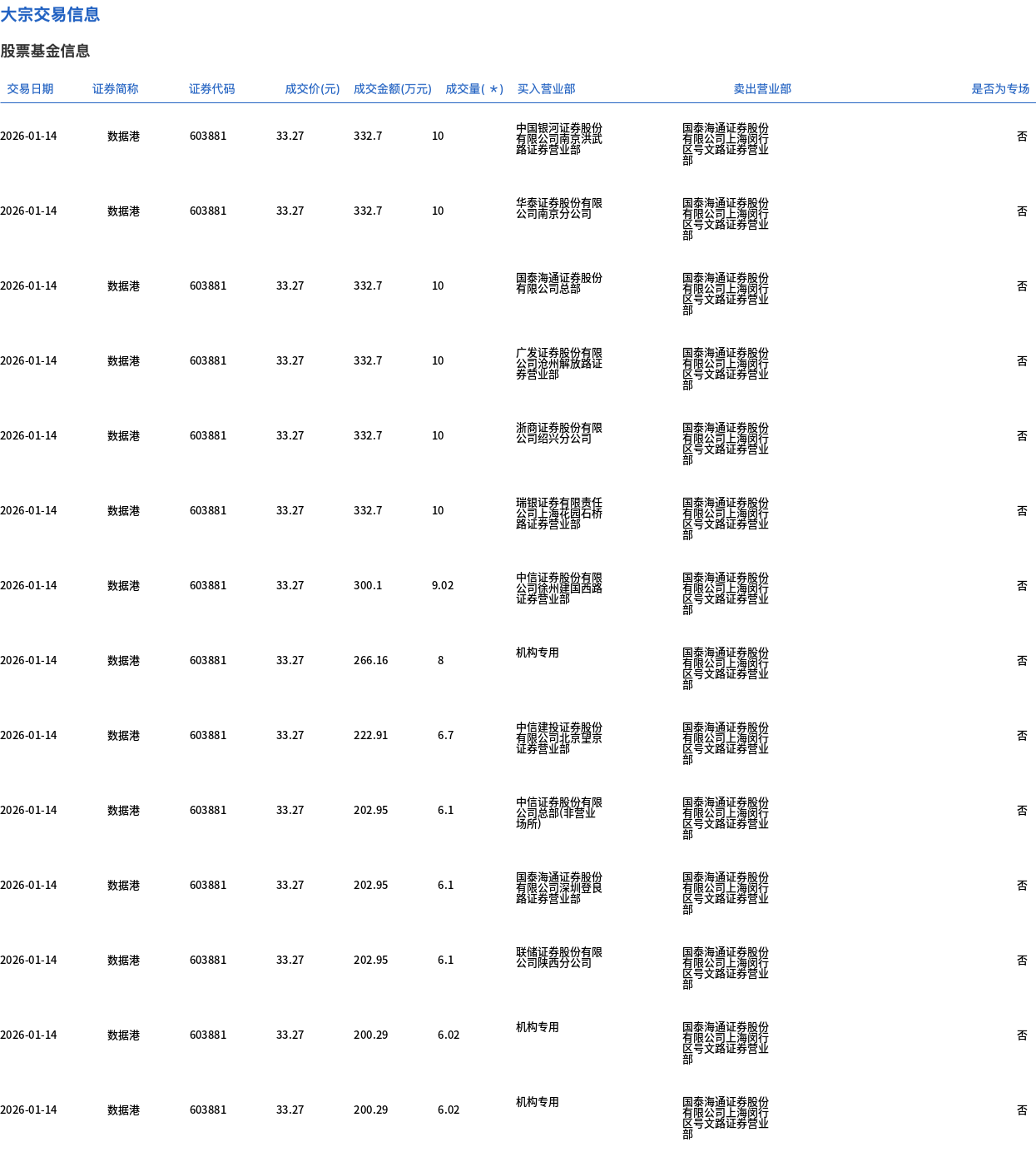 数据港今日大宗交易折价成交249.06万股,成交额8286.25万元