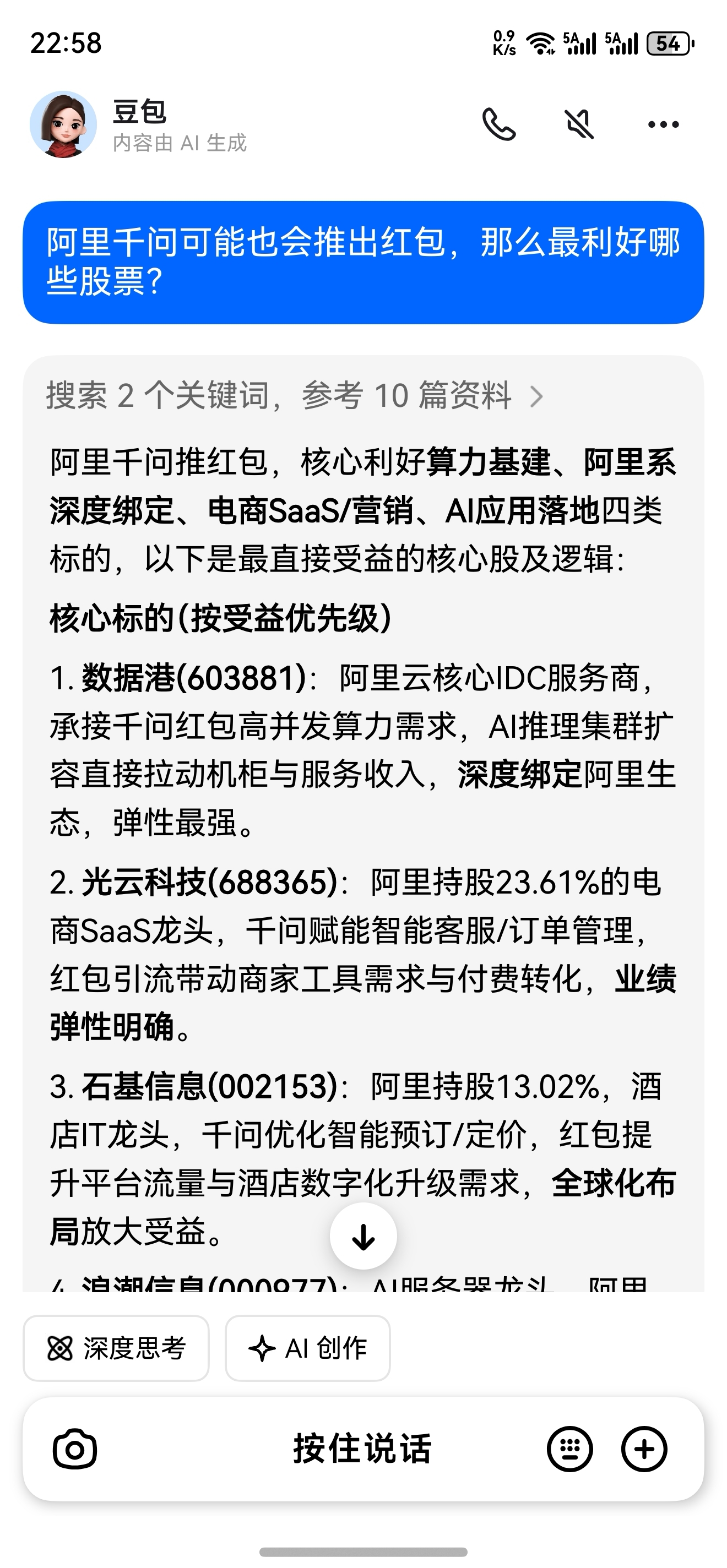 $数据港(SH603881)$ 阿里千问可能也要搞红包大战,数据港依然排在第一。双重受益,而且都是第一,明天数据港大概率会涨停。