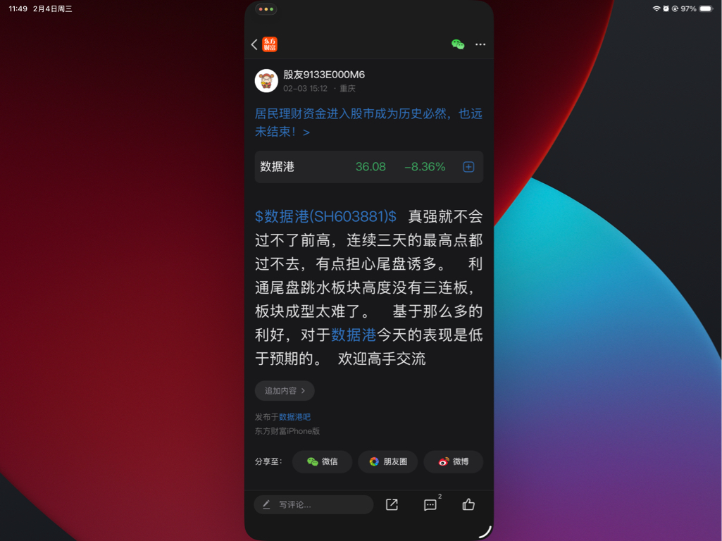 $数据港(SH603881)$ 昨天明显不及预期+尾盘诱多,2:56果断跑了。
