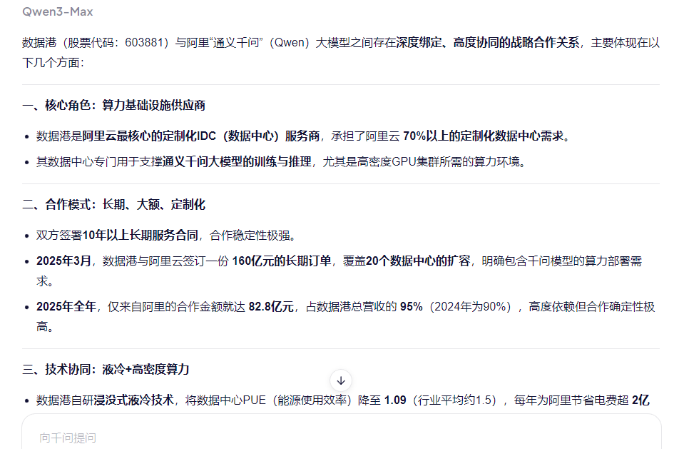 数据港(股票代码:603881)与阿里“通义千问”(Qwen)大模型之间存在深度绑定、高度协同的战略合作关系