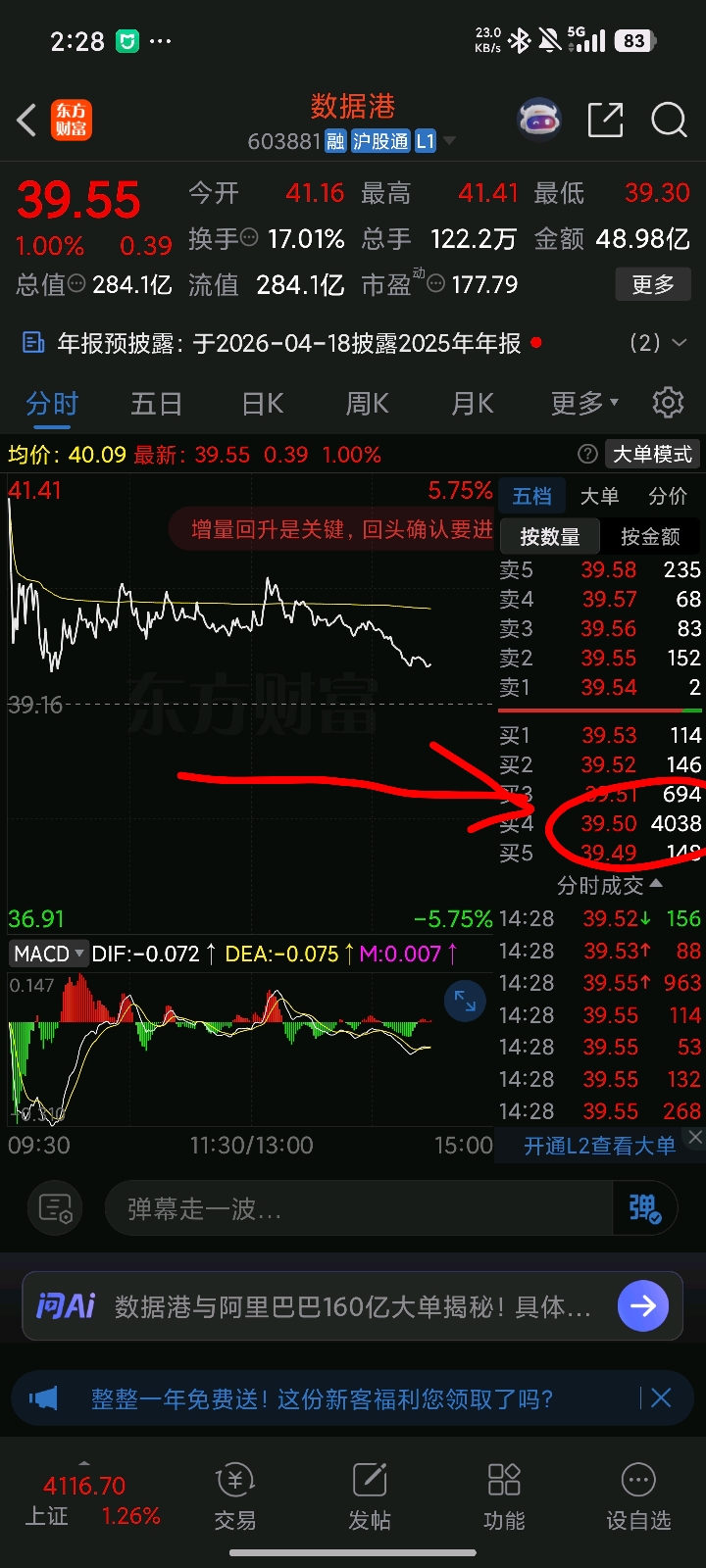 $数据港(SH603881)$ 下跌趋势中的巨量托单,,,,完了,擦