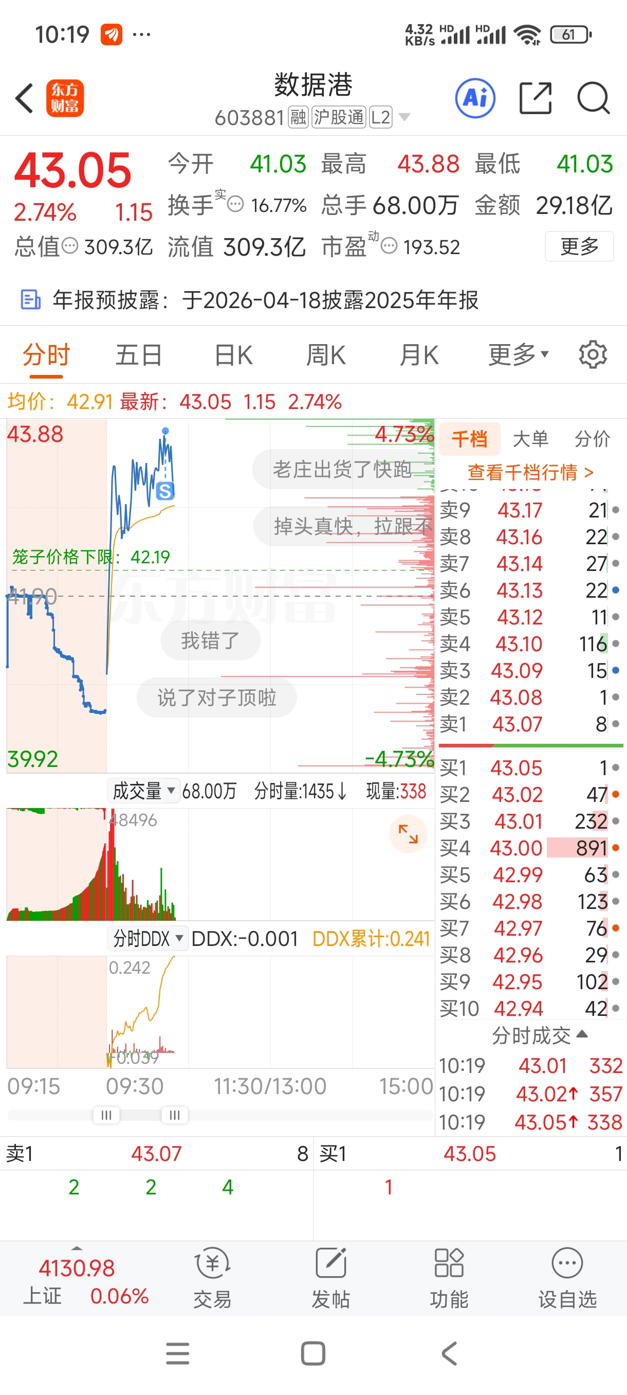 $数据港(SH603881)$ 格局一早上稳不住43.8,只能先清了,留下兄弟下午发财