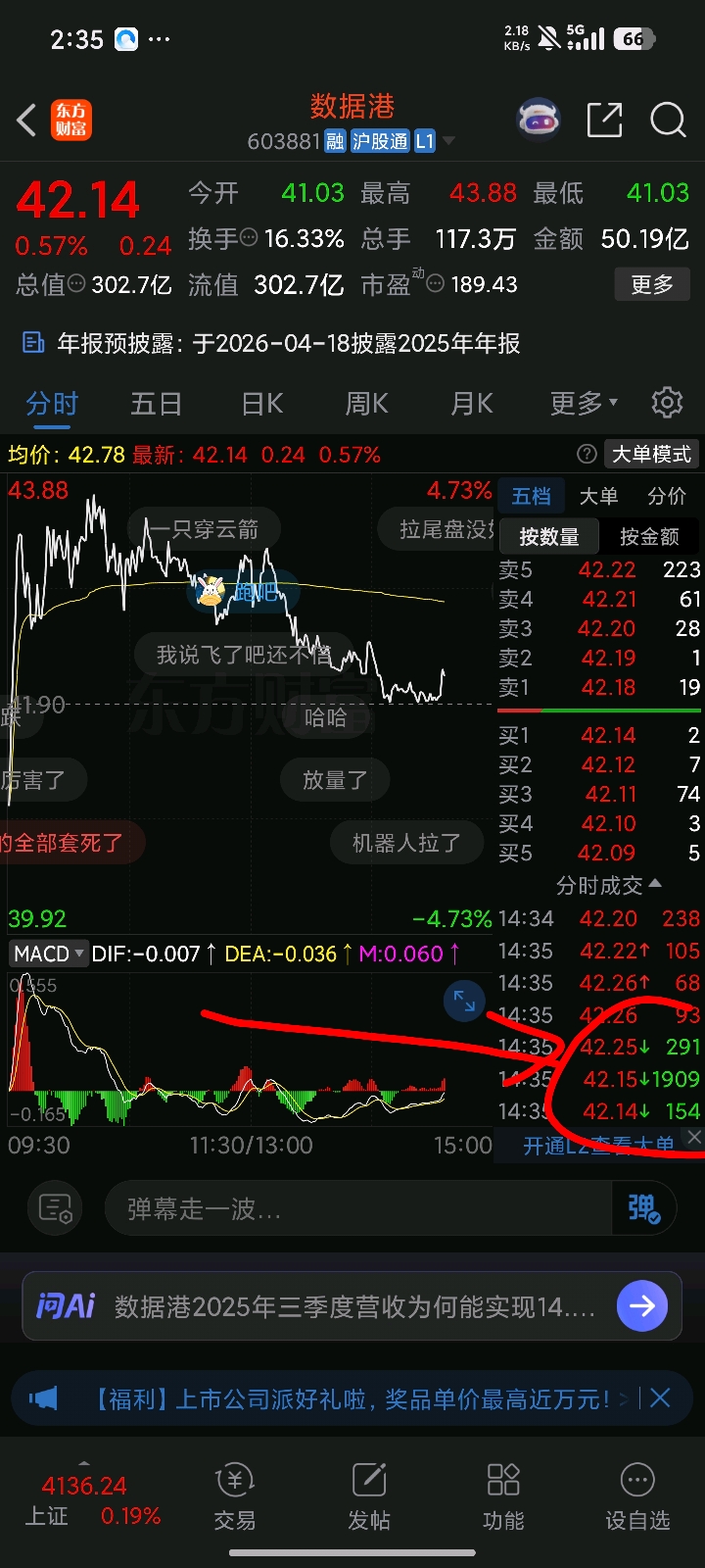 $数据港(SH603881)$ 小单拉,大单砸,,