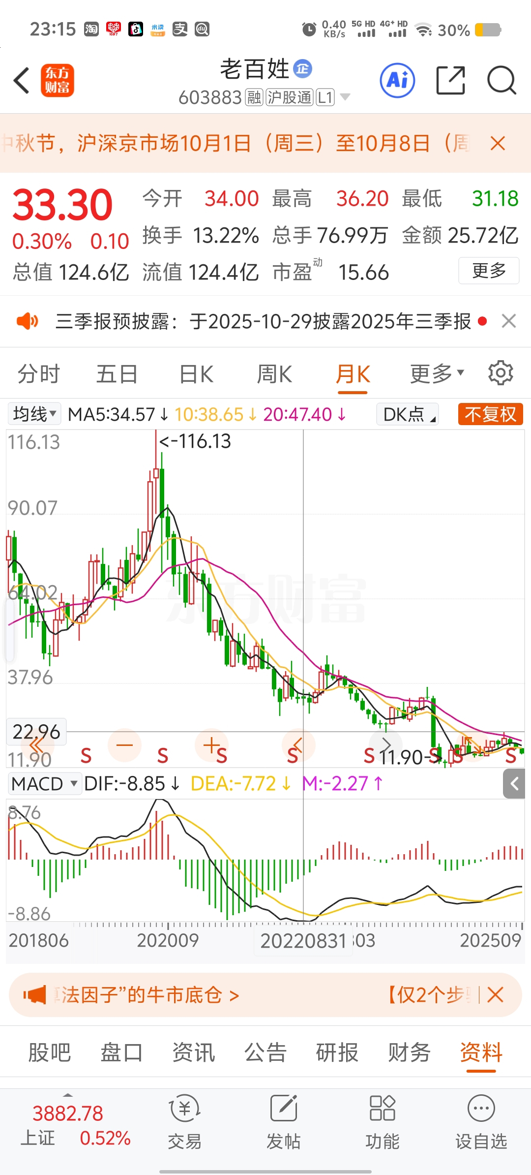 $老百姓(SH603883)$ 急涨慢跌,不断创新低,继续看好6块附近发起翻倍行情!