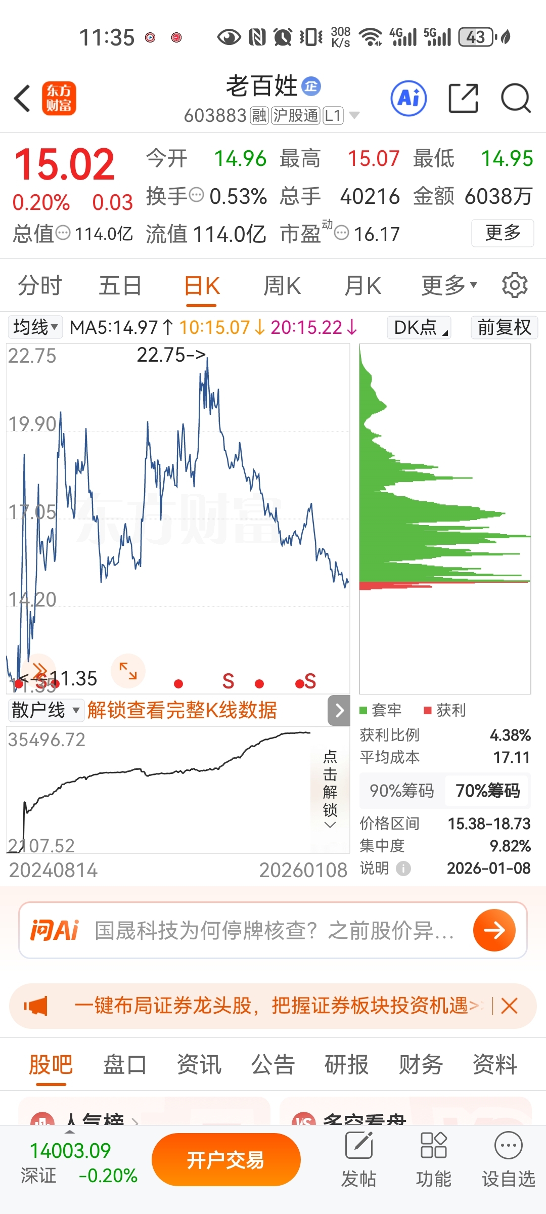 $老百姓(SH603883)$ 这个筹码峰就确定了,不会拉它,都是套牢盘,密密麻麻