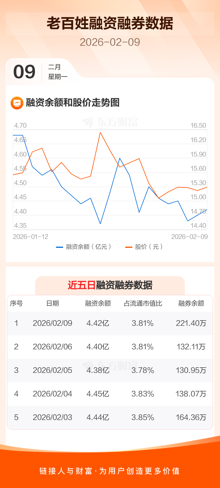 交易所最新数据显示,老百姓于2026年2月9日获融资买入1176.38万元,融资偿还925.11万元,当日融资净买入251.27万元。目前,该股融资余额4.42亿,占流通市值比例为3.81%。