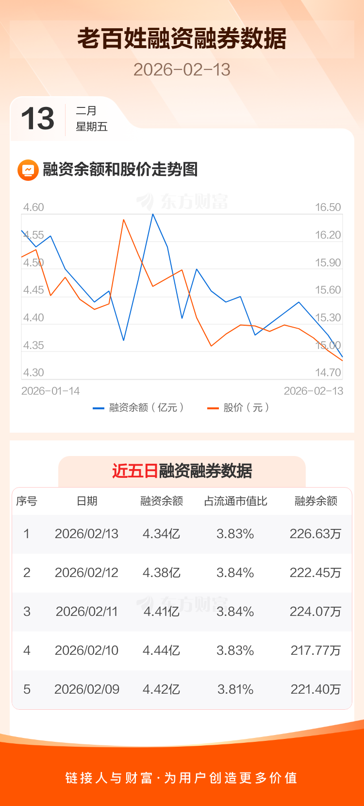 交易所最新数据显示,老百姓于2026年2月13日获融资买入472.68万元,融资偿还892.00万元,当日融资净偿还419.32万元。目前,该股融资余额4.34亿,占流通市值比例为3.83%。