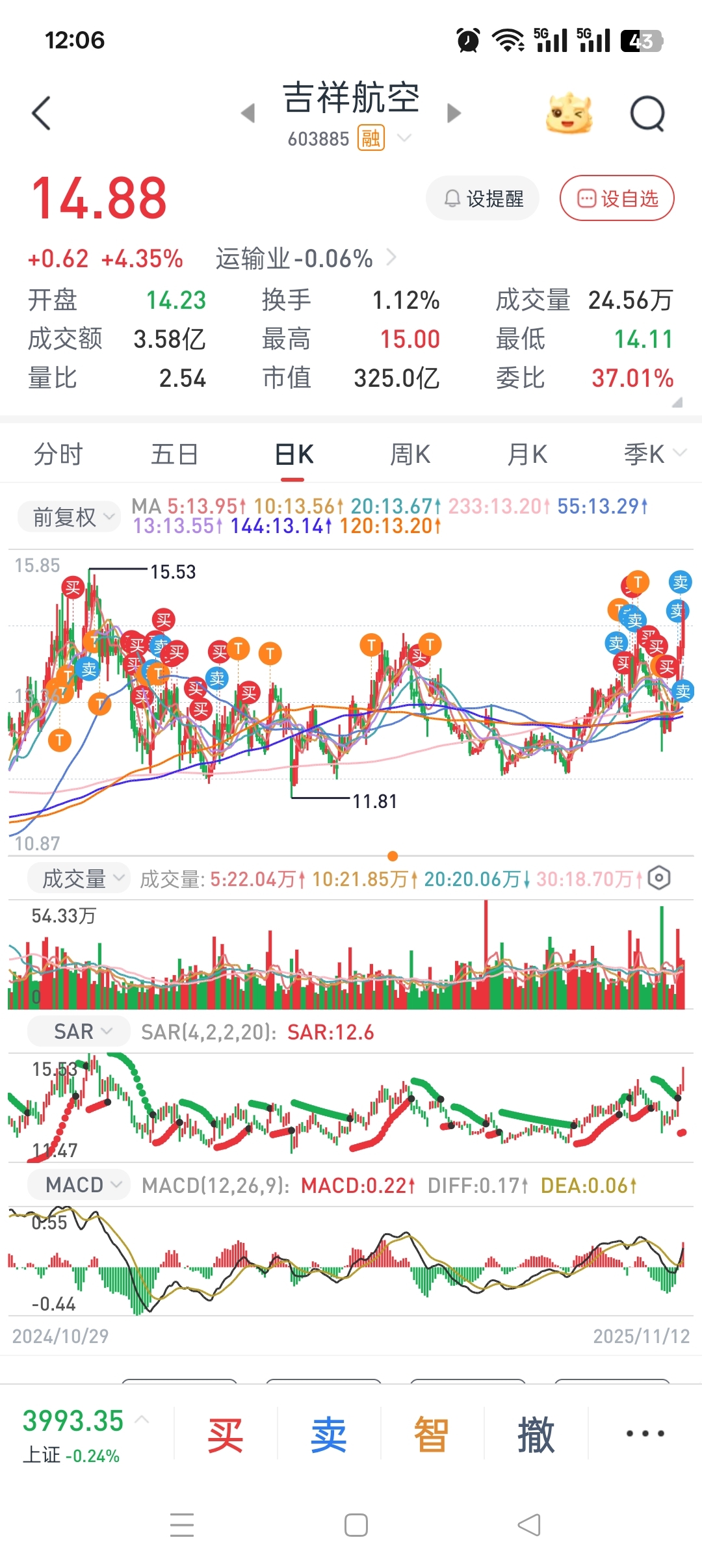 $吉祥航空(SH603885)$ 两次上14没怎么T,这次明知道会到15第一目标价,看到17,没忍住前两天t完只剩1000股,今天少赚两万多。