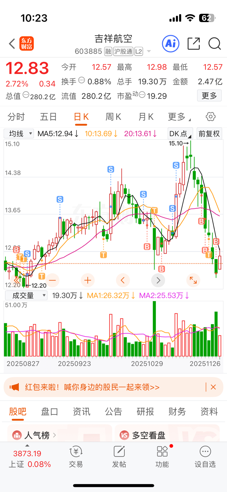 $吉祥航空(SH603885)$ $东方财富(SZ300059)$ 有时候还是应该见好就收,东方财富赚了12000见好就收了,吉祥航空赚了14000没走现在全部还回去了,