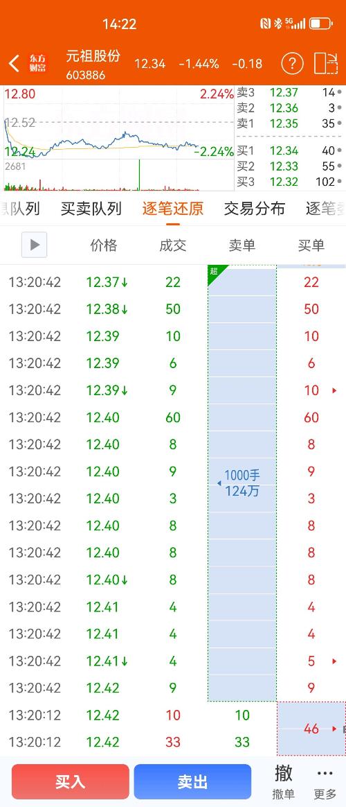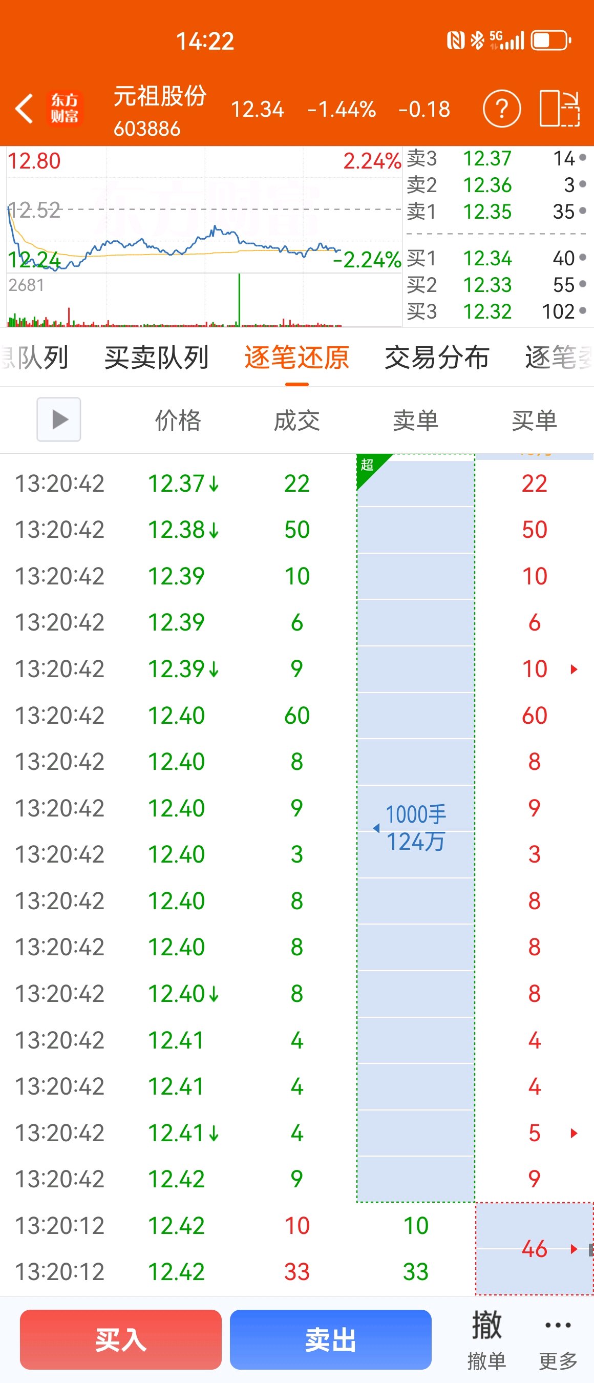 $元祖股份(SH603886)$ 请问下13:20成交的两个1000手是什么意思?挂单都没那么多是怎么能成交的呢?小白不懂,请大神赐教