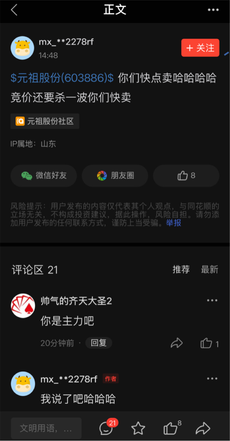 $元祖股份(SH603886)$ 主打一个听劝、得一半,不知道你们看见这个老妹儿的提醒没?