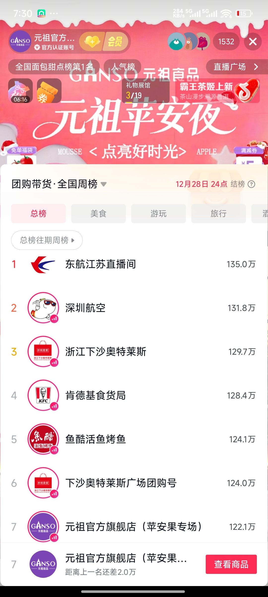 昨天看抖音团购直播,元祖食品板块第1,全品板块第7