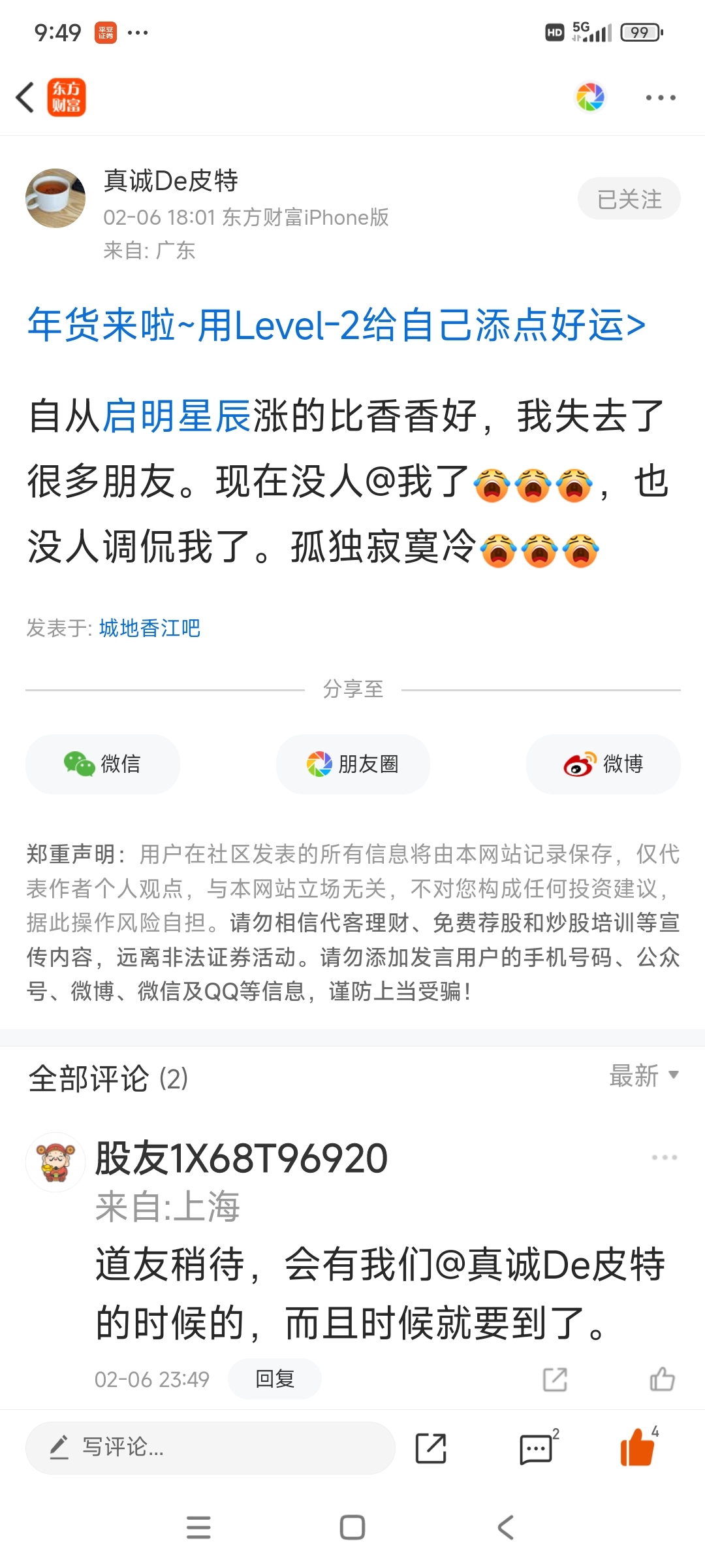 温馨提示: 1.根据《证券法》规定,禁止编造、传播虚假信息或者误导性信息,扰乱证券市场;2.用户在本社区发表的所有资料、言论等仅代表个人观点,与本网站立场无关,不对您构成任何投资建议。用户应基于自己的独立判断,自行决定证券投资并承担相应风险。《东方财富社区管理规定》