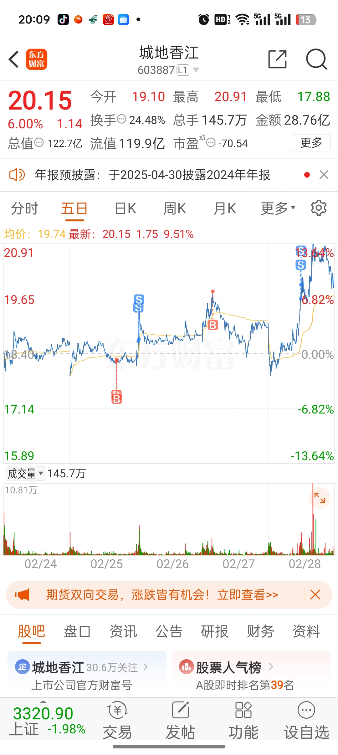 $城地香江(SH603887)$ 我是个新韭菜,进入股市才两个多月,在我手里的股票不会超过两天!
