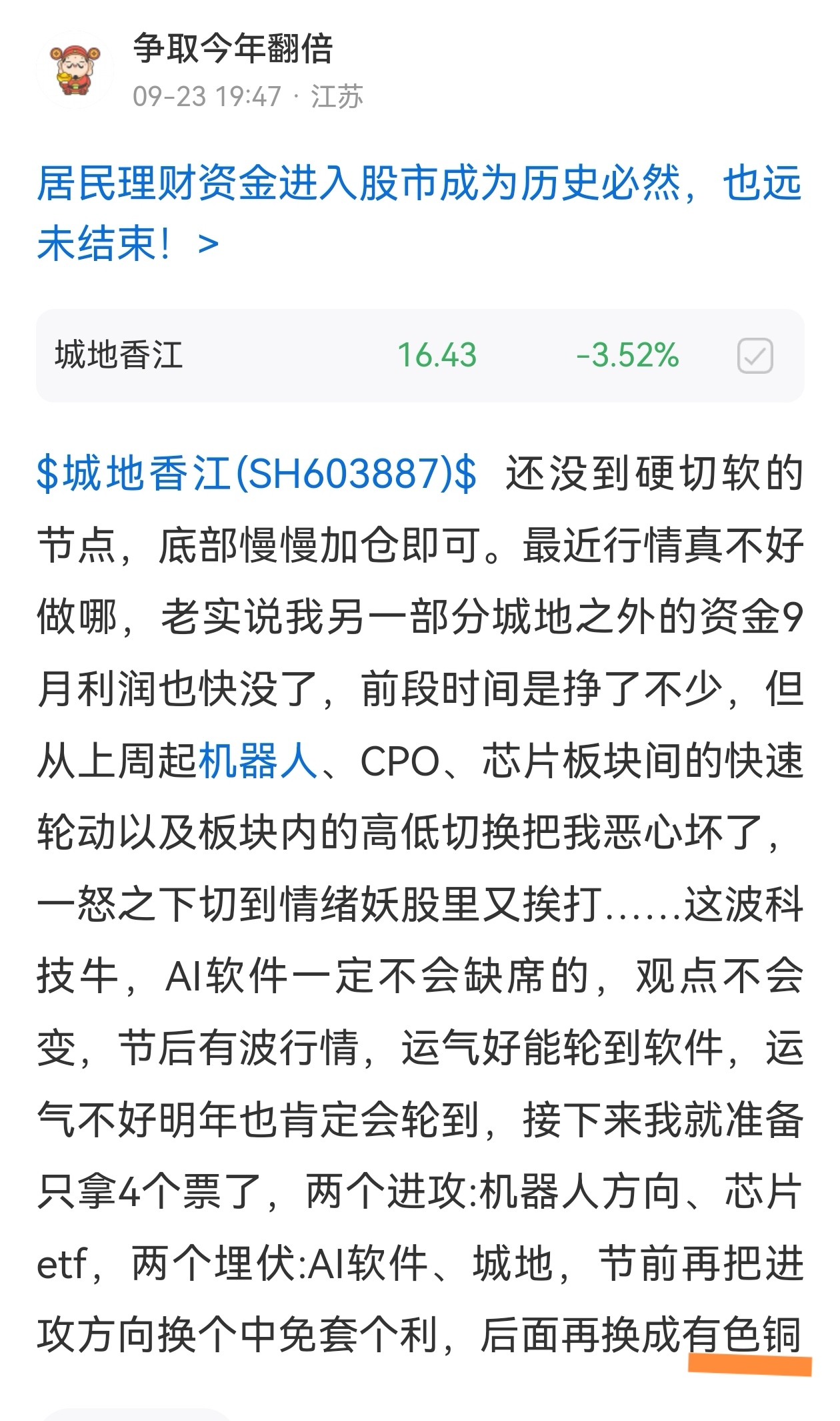 $城地香江(SH603887)$ 纯装一下,23日就精准猜中了有色的最强方向:铜!目前来看持仓效果还可以,24日以来收获机器人(三花)1个点、芯片ETF9个点、AI软件(能科)5个点、铜26个点、城地-6个点,但又一次被城地拖累!接下来仍保持分仓,一边继续埋伏城地,一边继续猛干芯片半导体主线,一边继续博弈优质AI软件三季报,一边逢低接回工业有色!