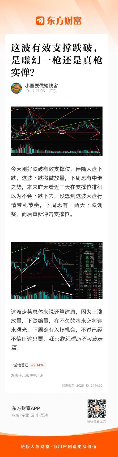 今天刚好跌破有效支撑位,伴随大盘下跌,这波下跌微微放量,下周恐有中继之势,本来昨天看近三天在支撑位徘徊以为不会下跌下去,没想到这波大盘行情带乱节奏,下周恐有一两天下跌调整,而后重新冲击支撑位。