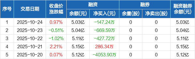 融资方面,当日融资买入1657.05万元,融资偿还1804.29万元,融资净偿还147.24万元,连续3日净偿还累计1244.55万元。融券方面,融券卖出0股,融券偿还0股,融券余量0股,融券余额0元。融资融券余额合计5.03亿元。