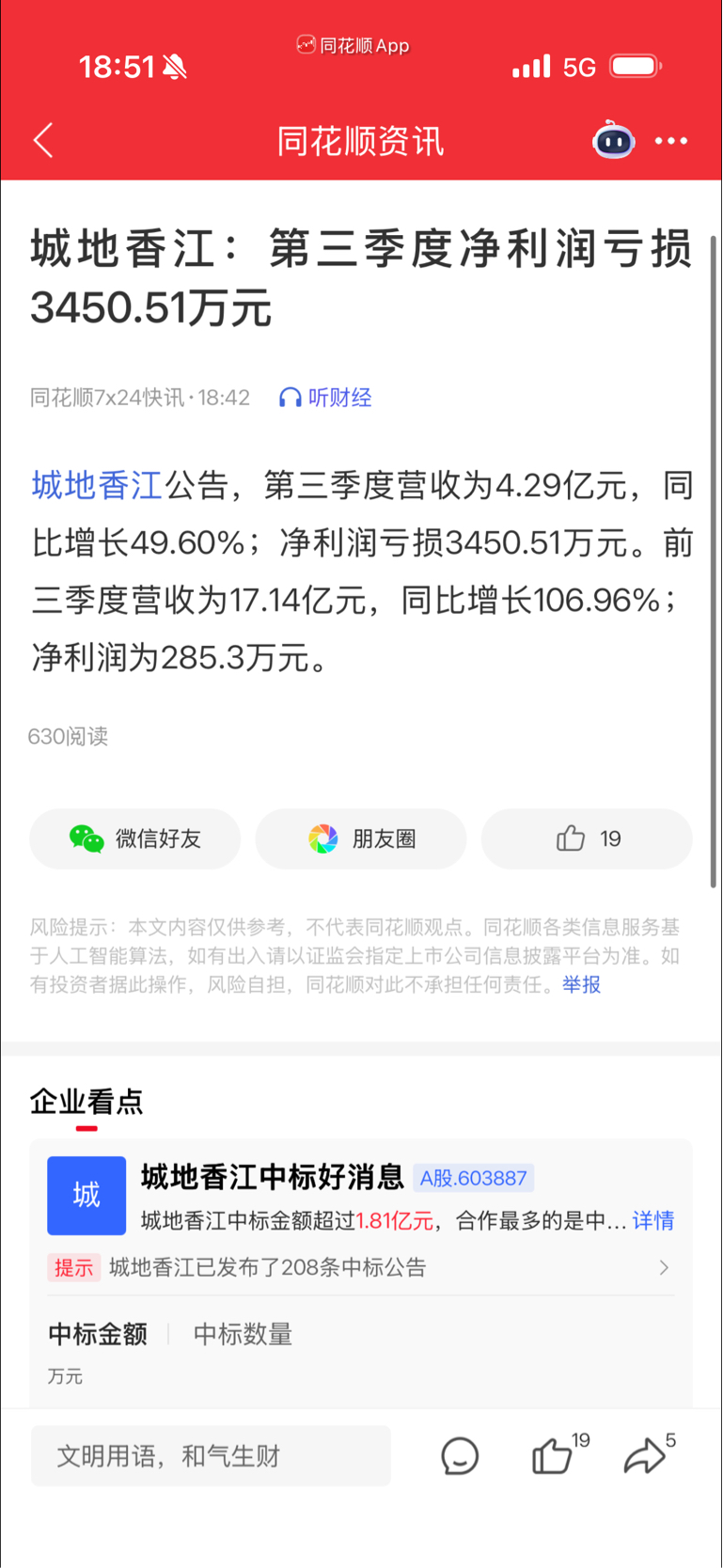 $城地香江(SH603887)$ 爆炸了,又亏了3400多万,今年净利只剩200万了哈哈