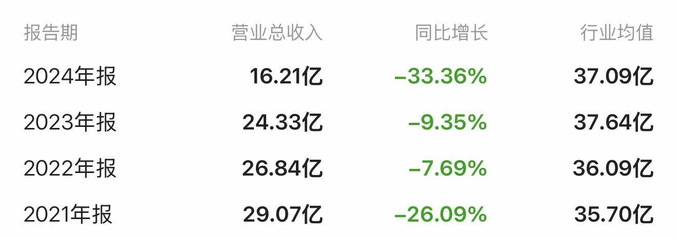 值得一提的是,2021年至2024年,公司分别实现营业收入29.07亿元、26.94亿元、24.33亿元、16.21亿元,其营收已连续四年下滑。