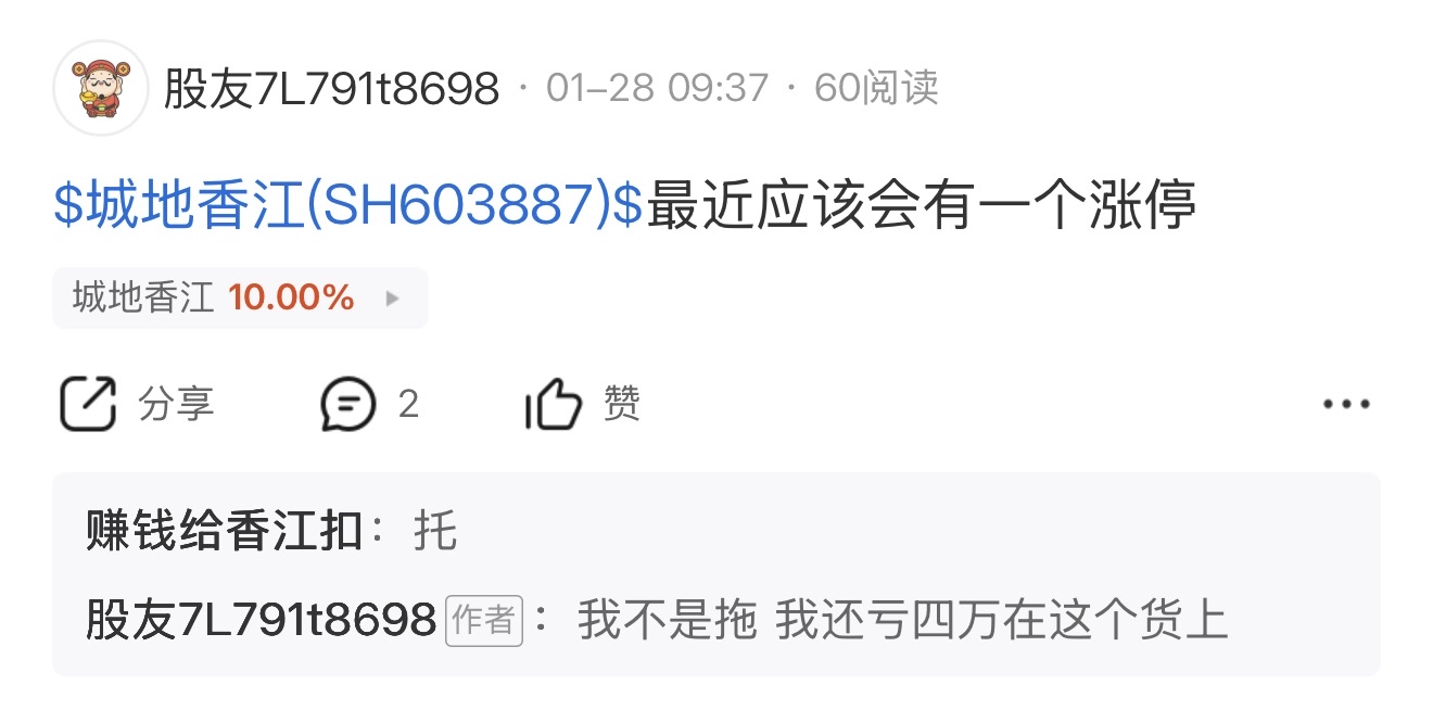 $城地香江(SH603887)$ 事实证明我这话没毛病,因为我亏太多 这票跌太久了 我知道该涨了