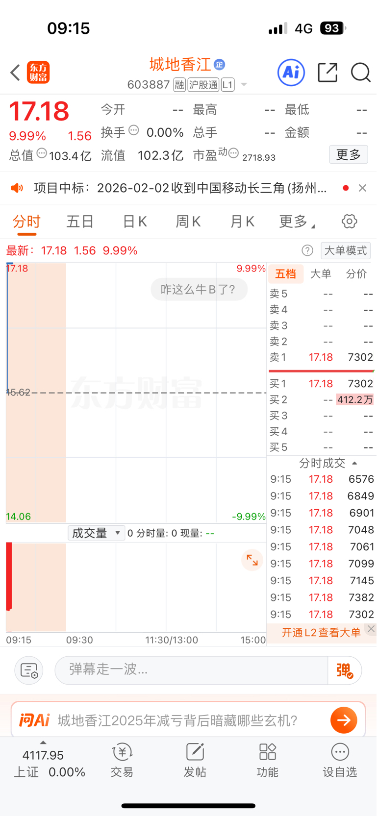 $城地香江(SH603887)$ 假想意涨停,留念