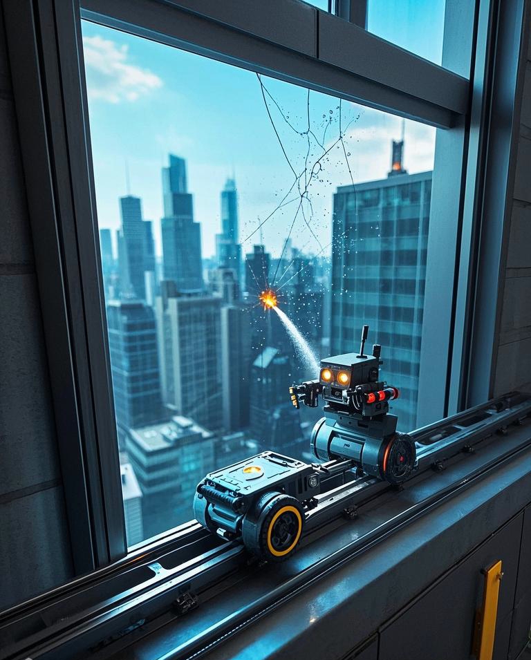 (2). 精准定位:利用在外墙壁预先铺设的轨道,机器人能够在1分钟内精准到达着火房间的玻璃窗外。