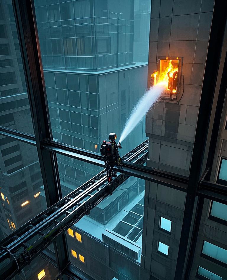 三:爬壁钻窗智能灭火机器人这个场景描述了一种先进的智能灭火机器人,它能够在高楼大厦发生火灾时迅速响应并进行灭火。这种机器人具备以下几个特点: