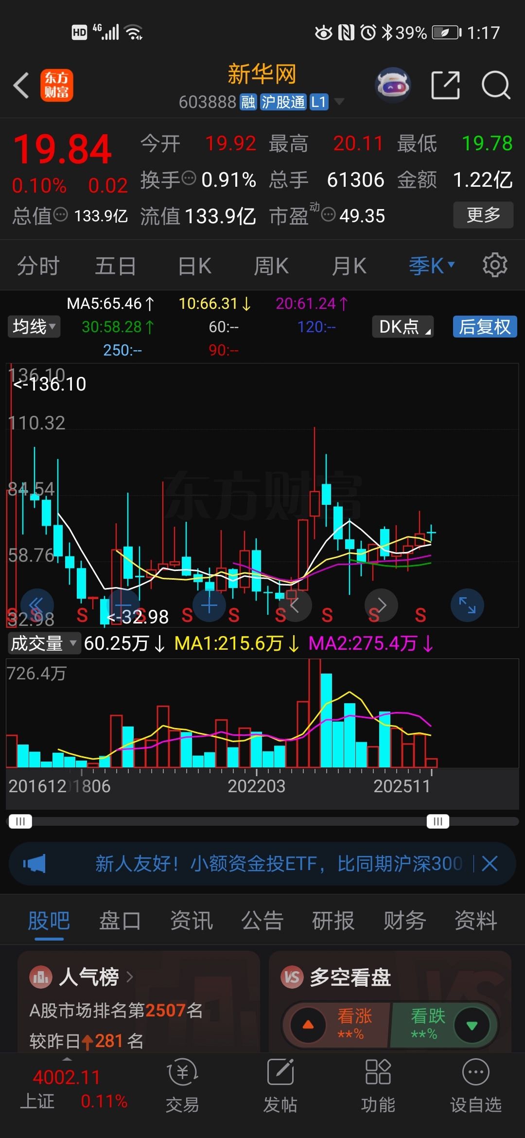 $新华网(SH603888)$ ,低位股,上市快10年,最低点到现在才涨了1倍,但中间折腾了无数倍。。。。安全。