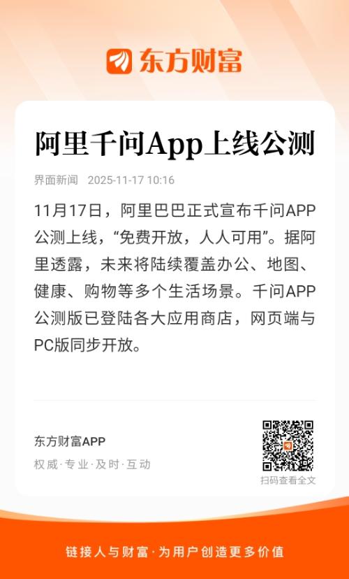 11月17日,阿里巴巴正式宣布千问APP公测上线,“免费开放,人人可用”。据阿里透露,未来将陆续覆盖办公、地图、健康、购物等多个生活场景。千问APP公测版已登陆各大应用商店,网页端与PC版同步开放。