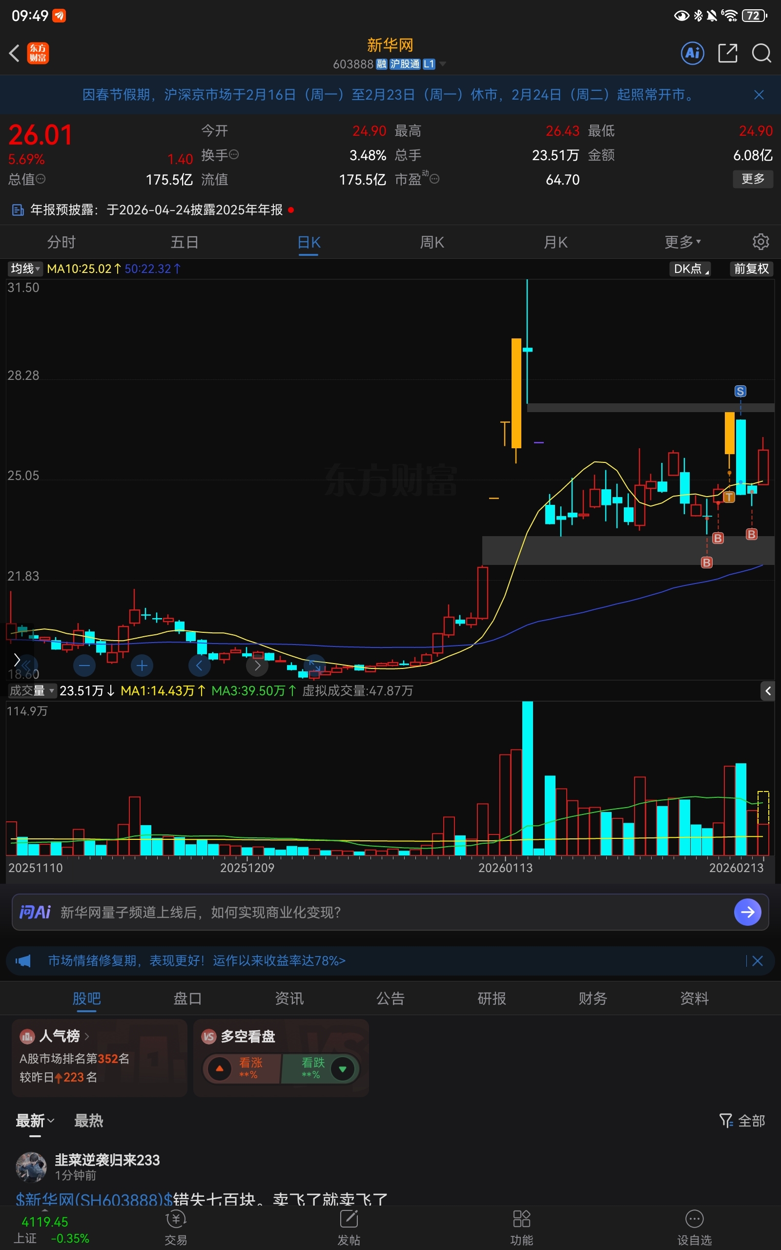 温馨提示: 1.根据《证券法》规定,禁止编造、传播虚假信息或者误导性信息,扰乱证券市场;2.用户在本社区发表的所有资料、言论等仅代表个人观点,与本网站立场无关,不对您构成任何投资建议。用户应基于自己的独立判断,自行决定证券投资并承担相应风险。《东方财富社区管理规定》