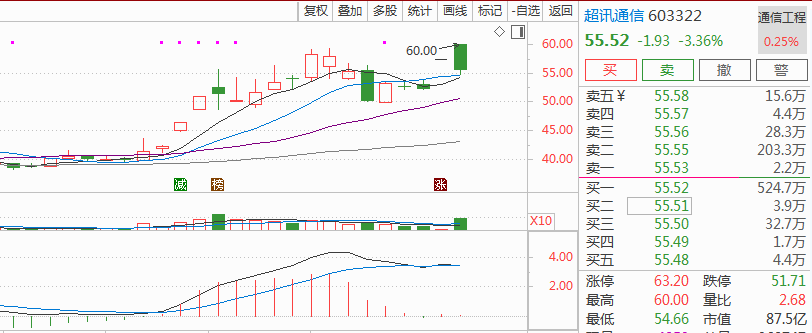 这票是昨天沐曦概念里边唯一一只一字板的,今天都跳水了,说明这个题材是被市场冷落了,如果不是“深地经济”横空出世,今天沐曦概念兴许还能再走一波,超讯通信正借与沐曦的深度合作,实现业务与业绩的双重突破。2025 年上半年,它交出营收16.11亿元、同比增 96%,归母净利7200万元、同比增155%的亮眼成绩,这主要靠沐曦国产GPU批量交付和自身算力业务验收达标。公司如今既是沐曦 “独家销售”,也是 “合资伙伴”,身兼经销商与生产商。今年初,它还联合沐曦成立控股子公司 “讯曦智能”,将业务拓展到芯片封测、服务器产销及维修,强化国产算力布局。未来,沐曦 GPU 销量将直接拉动其收溢。早评的逻辑是超汛通信的意义在于在打造老鸭头形态,今天突破10月10日的高点应该难度不大,不连板的话就要考虑这个压力点变支撑点了。今天就突破前期高点了,不过是高开突破之后就跳水了,高点再次变成压力,但明天如果能出现反包,它的二波趋势就不会变。