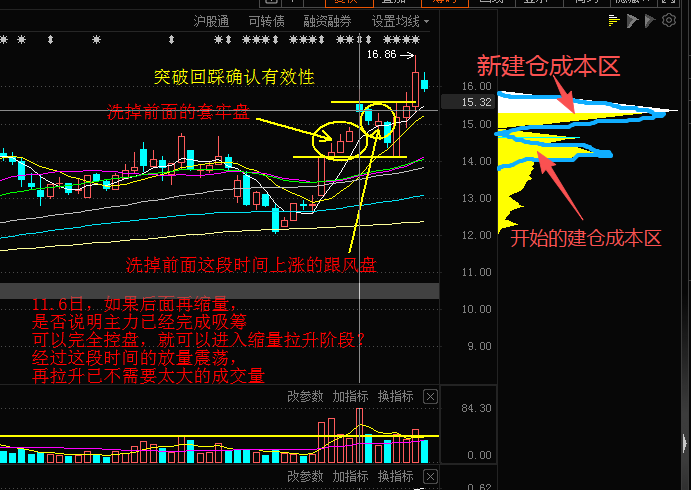 既然出货的假设不成立,那么我们就可以认定三天的放量滞涨是在洗掉前面的套牢筹码(股价围绕前面套牢平台的上端,一直放量但是滞涨,就是不突破,这种胶着,便于让前面的套牢筹码卖出);