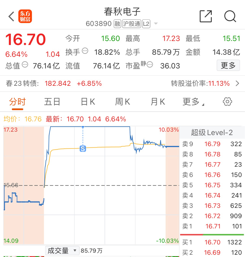 $春秋电子(SH603890)$ 还好,看转债走势不稳,担心受转债影响板上走人了