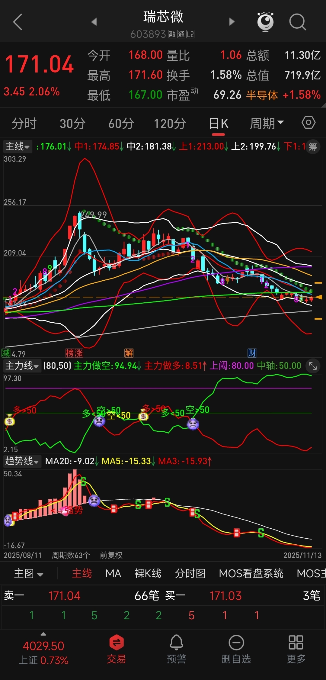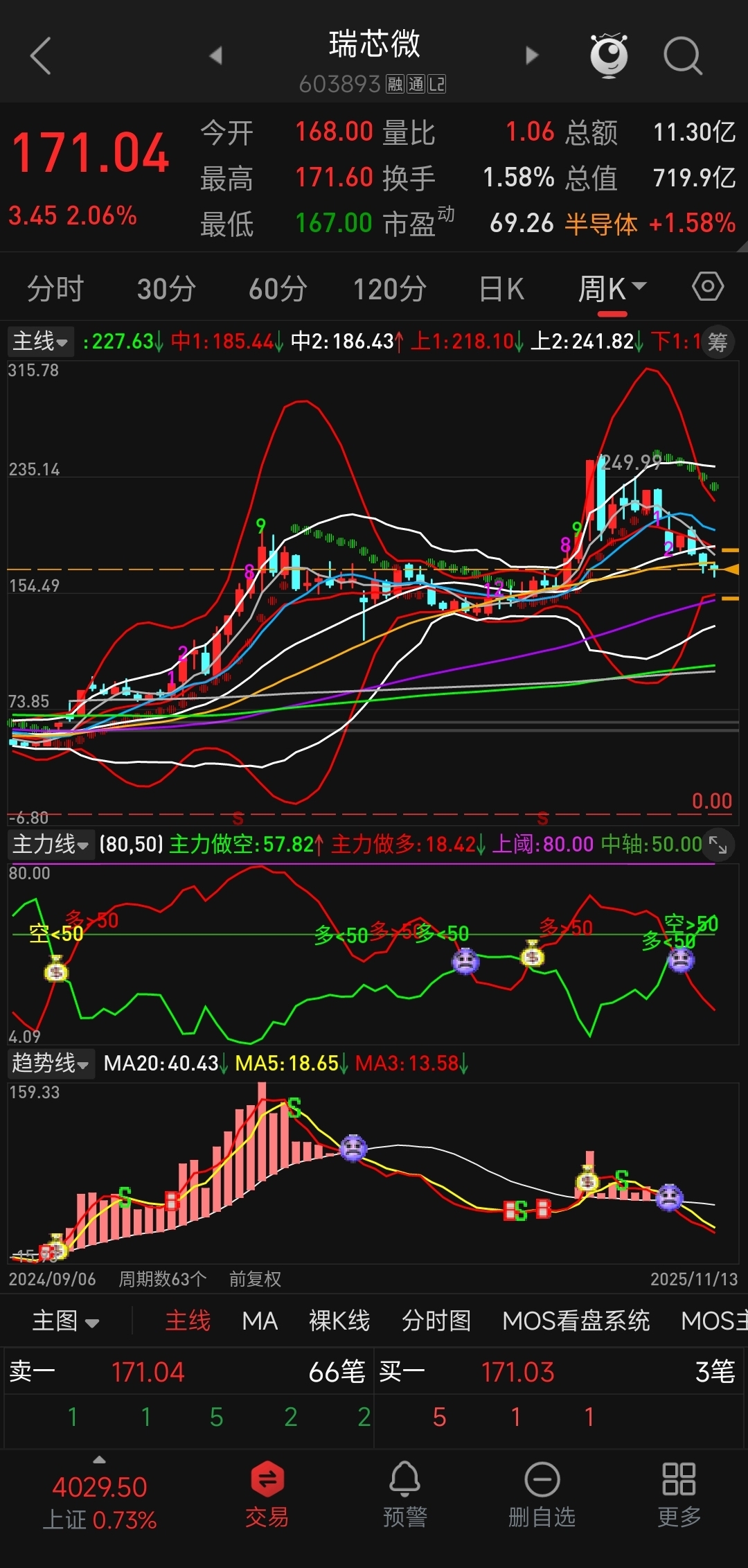 日线向下开口,主力做空线冲破天花板强势运行,趋势线一路下行。周线收口,主力线、趋