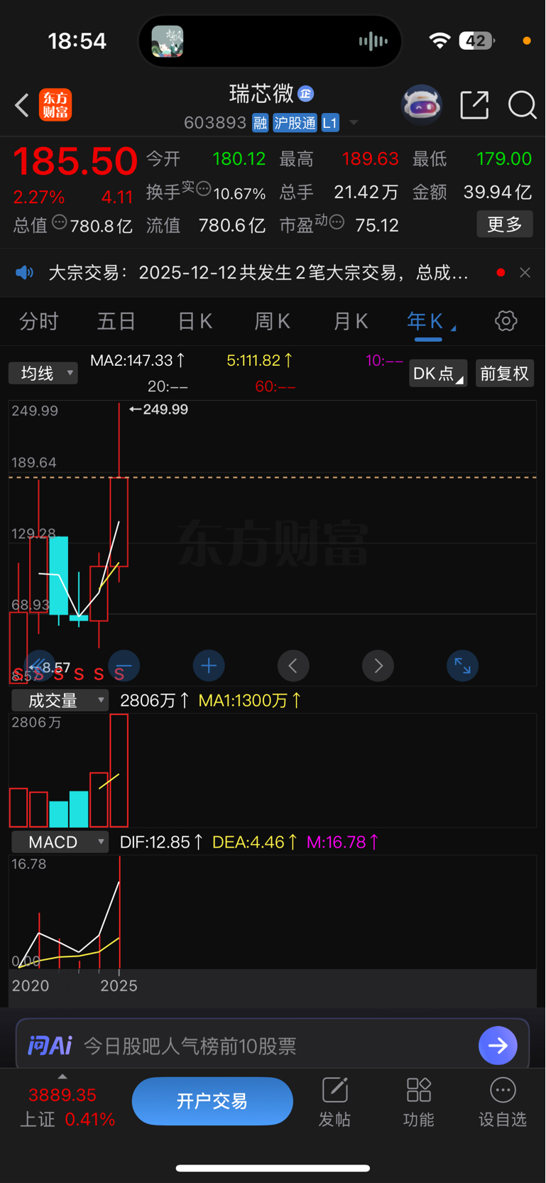 $瑞芯微(SH603893)$ 说个鬼故事,上次瑞芯微长这样的年线后第二年跌了50%