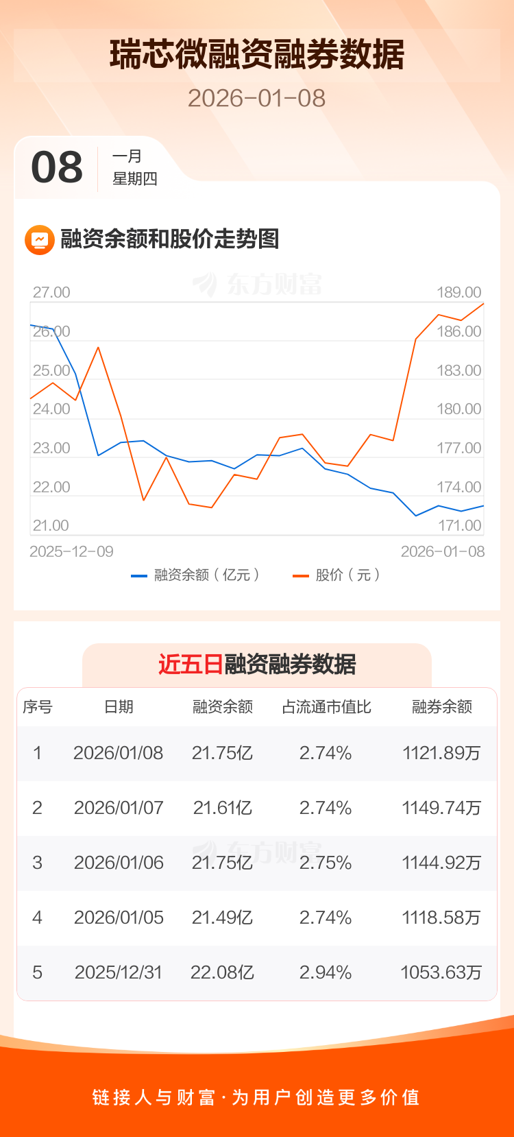 交易所最新数据显示,瑞芯微于2026年1月8日获融资买入2.34亿元,融资偿还2.20亿元,当日融资净买入1403.46万元。目前,该股融资余额21.75亿,占流通市值比例为2.74%。