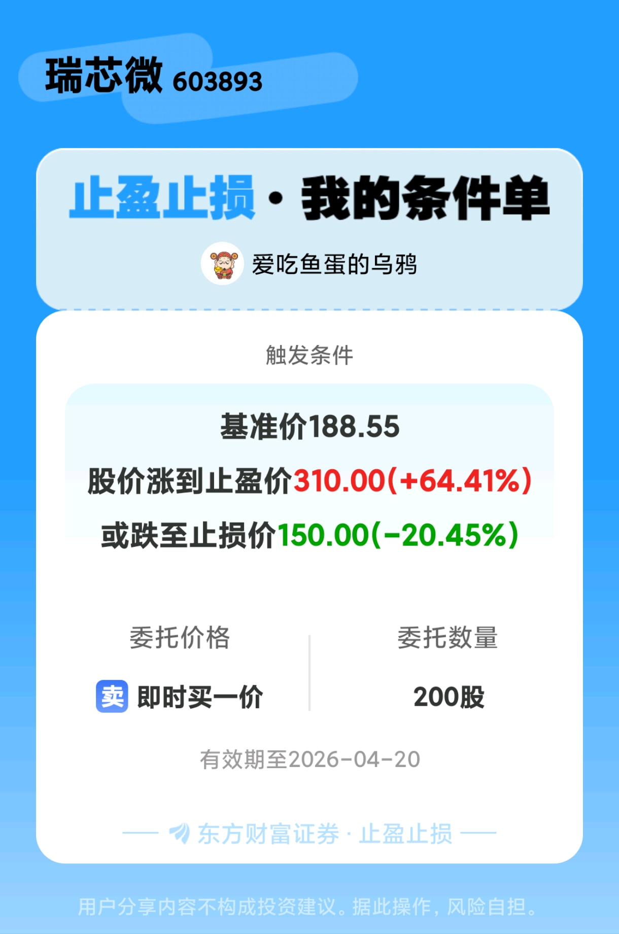 温馨提示: 1.根据《证券法》规定,禁止编造、传播虚假信息或者误导性信息,扰乱证券市场;2.用户在本社区发表的所有资料、言论等仅代表个人观点,与本网站立场无关,不对您构成任何投资建议。用户应基于自己的独立判断,自行决定证券投资并承担相应风险。《东方财富社区管理规定》