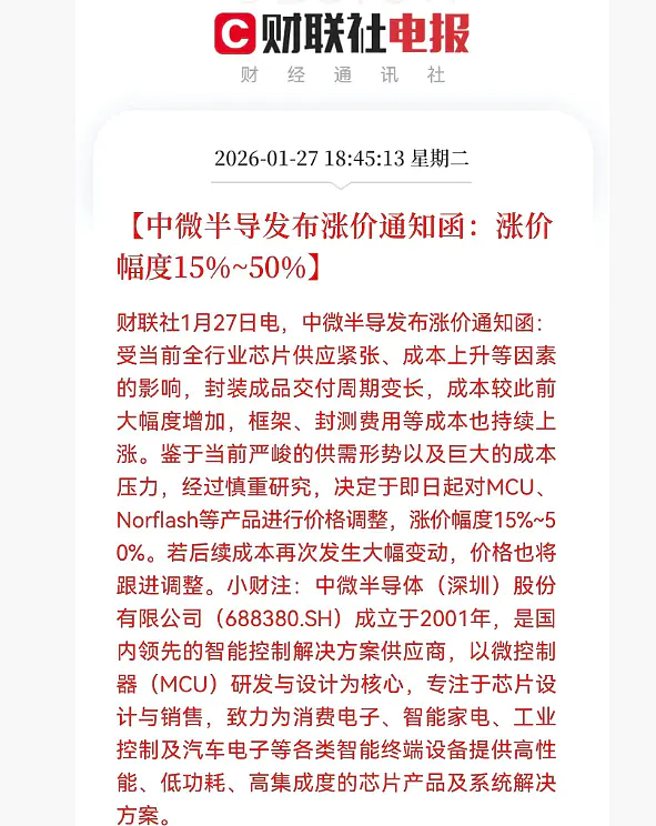 【国K微发出涨价函 1月起部分产品涨价80%】《科创板日报》27日讯