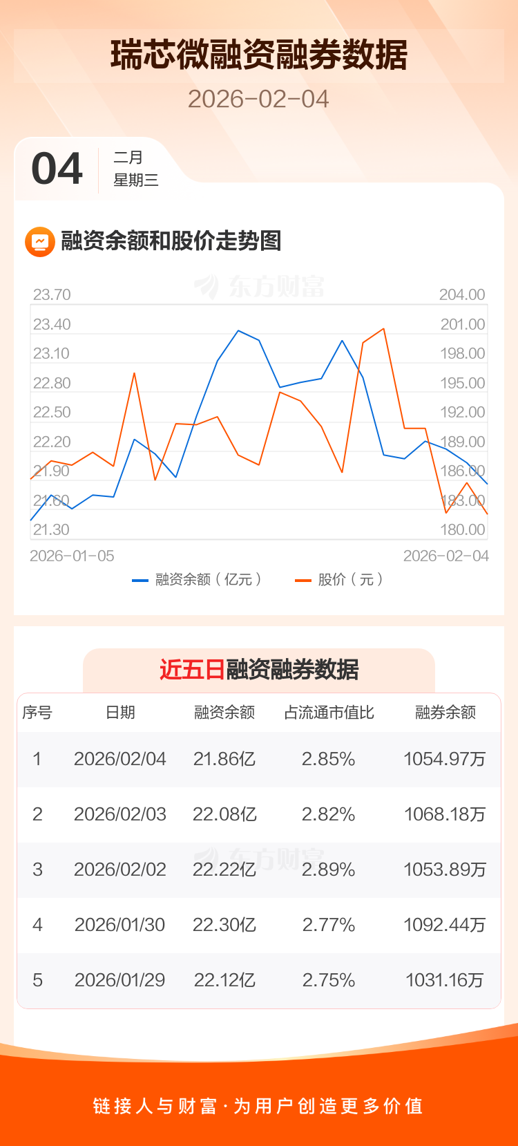 交易所最新数据显示,瑞芯微于2026年2月4日获融资买入1.04亿元,融资偿还1.26亿元,当日融资净偿还2222.61万元。目前,该股融资余额21.86亿,占流通市值比例为2.85%。